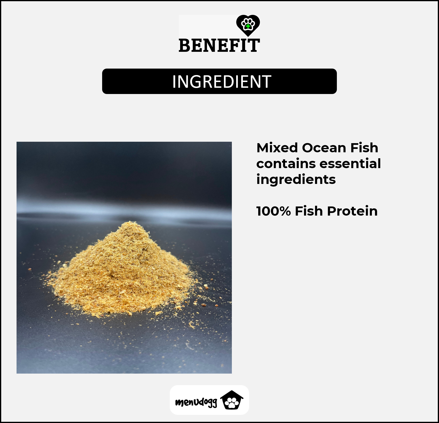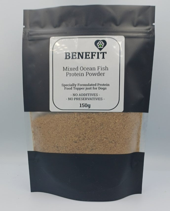Mixed ocean fish protein powder is a wholesome topper to add to your dog’s meal anytime. Fish is high in protein, but exceptionally low in fat, so it’s a perfect protein booster