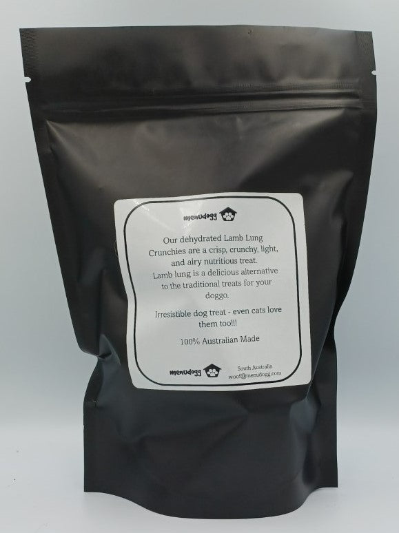 Our dehydrated Lamb Lung Crunchies are a crisp, crunchy, light, and airy nutritious treat. Lamb lung is a delicious alternative to the traditional treats for your doggo.