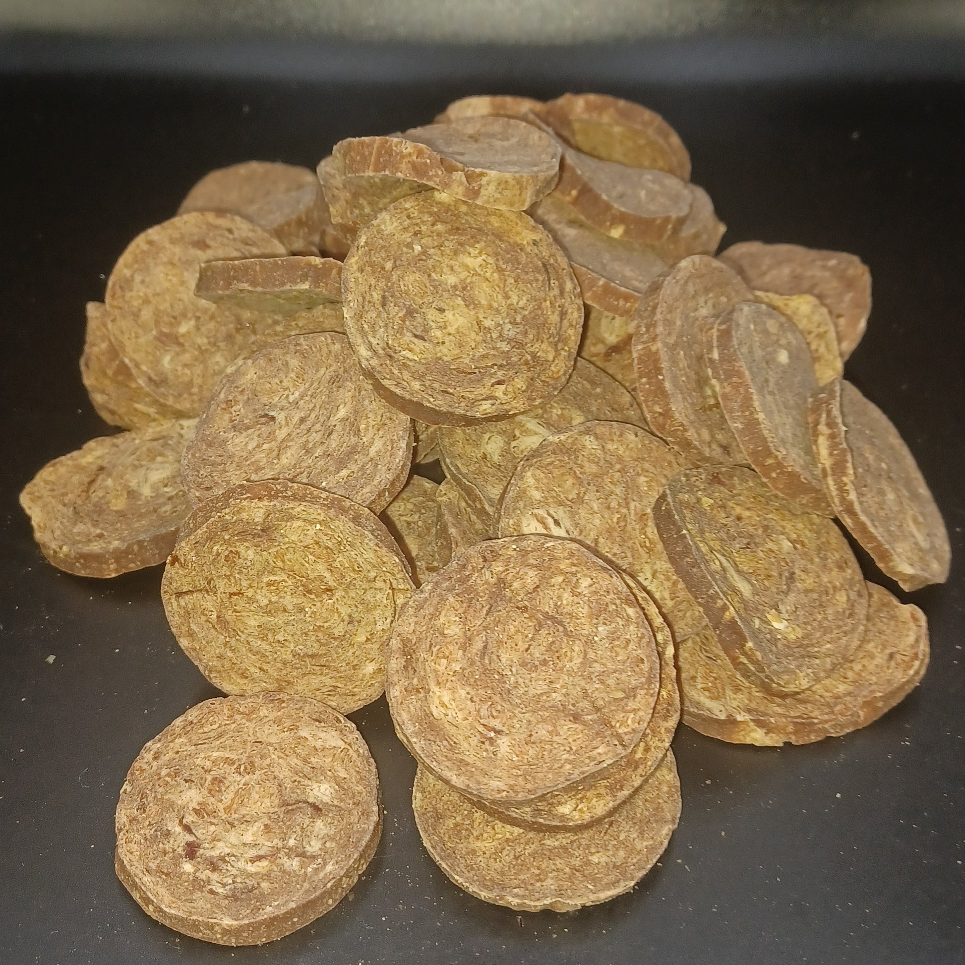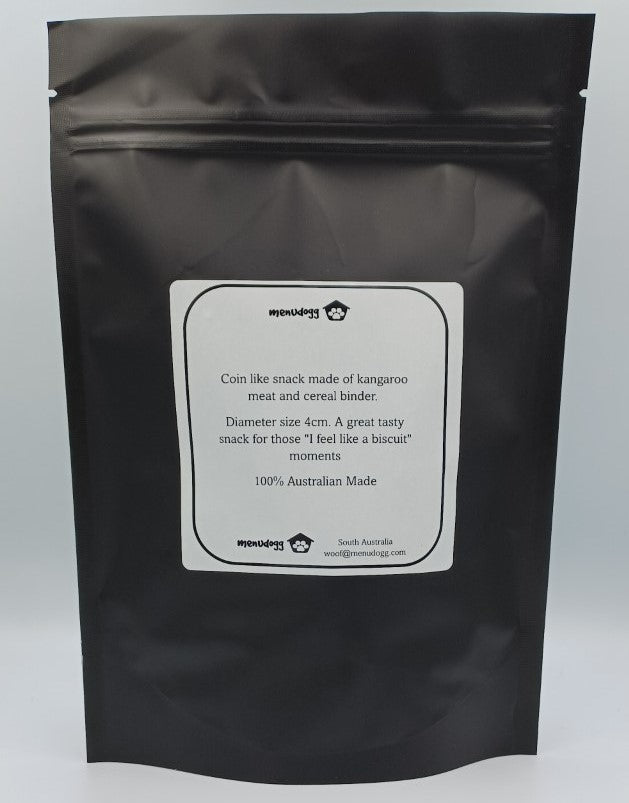 Coin like snack made of kangaroo meat and cereal binder.